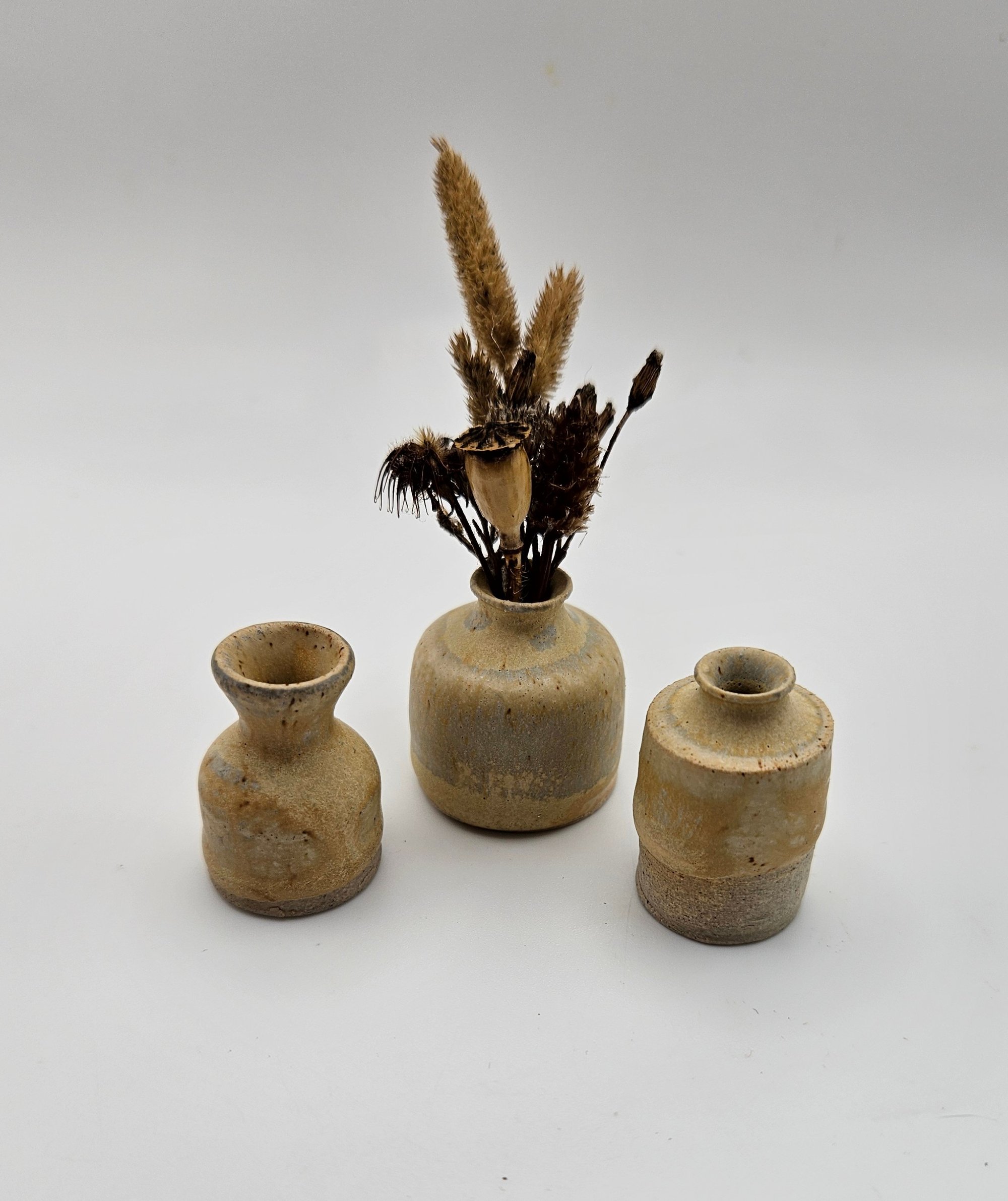 A trio of miniature stoneware vases in a matte beige glaze all standing at around 3cm.